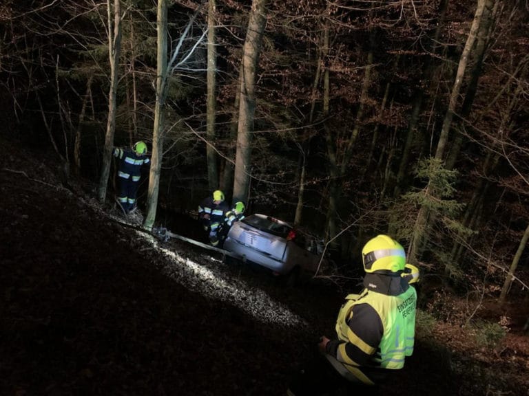 Situation beim Eintreffen: Die verletzte Person wurde von stehen gebliebenen Verkehrsteilnehmern erst versorgt. Die anwesenden Feuerwehrsanitäter übernahmen bis zum Eintreffen des mit alarmierten Rettungsdienstes die weitere Versorgung. Nach dem Abtransport der verletzten Person wurde das zwischen den Bäumen hängen gebliebene Fahrzeug mittels Seilwinde geborgen.